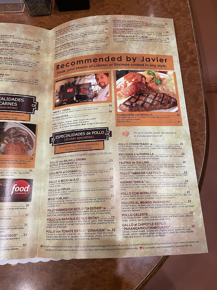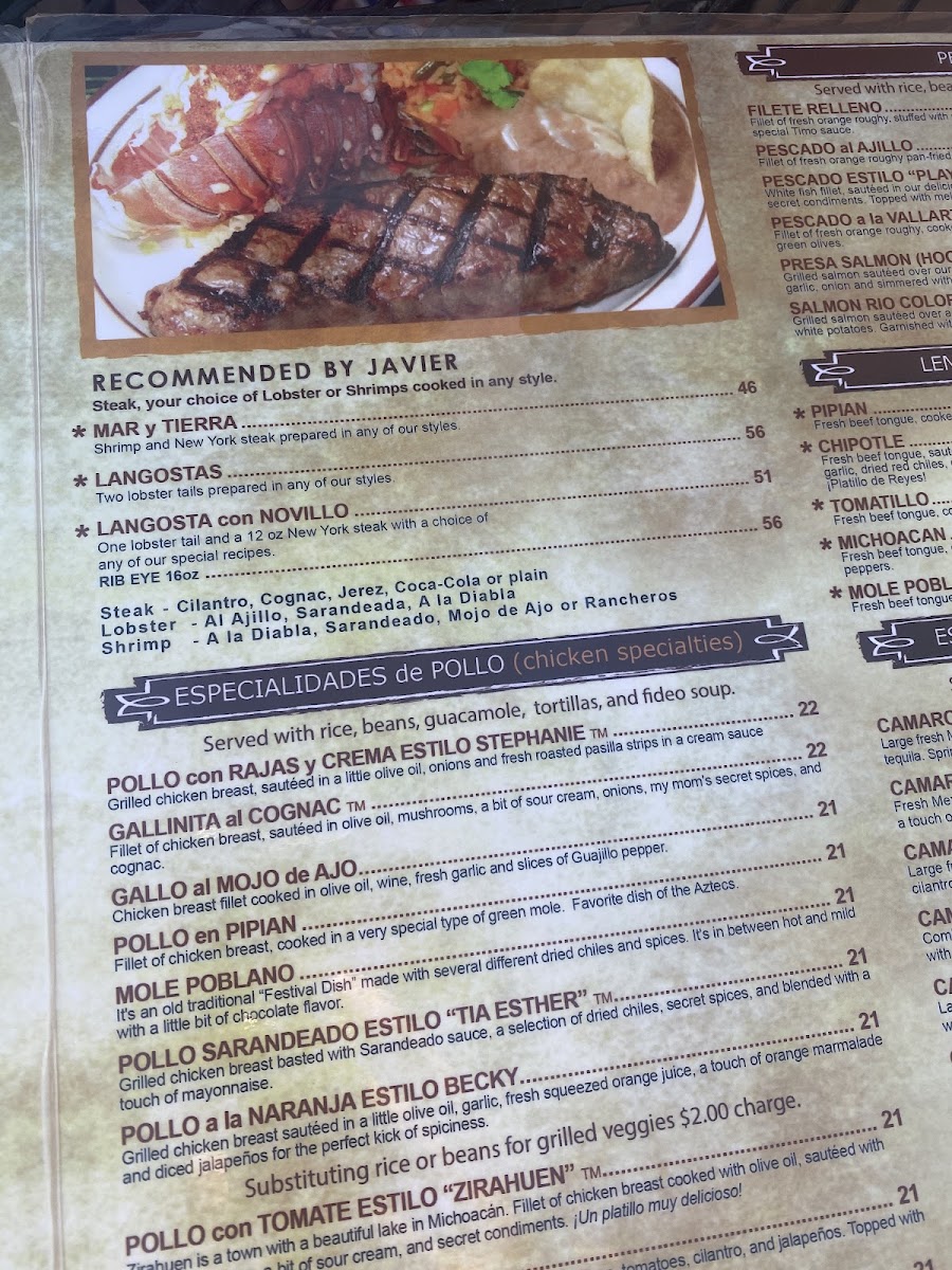 Thin New York steak broiled with lemon juice, and spices. Topped with sautéed tomatoes, onions, a little cilantro and jalapeno. Served with rice, beans, guacamole, tortillas, and fideo soup.