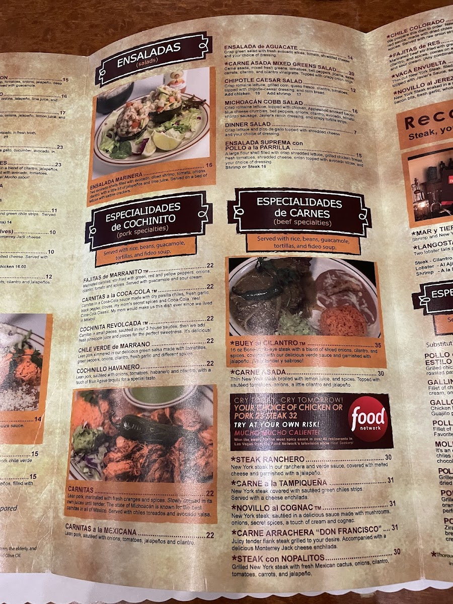 Carnitas in a coca-cola sauce made with dry pasilla chiles, fresh garlic, black pepper, cloves, spices and coca cola. Served with rice, beans, guacamole, tortillas, and fideo soup.