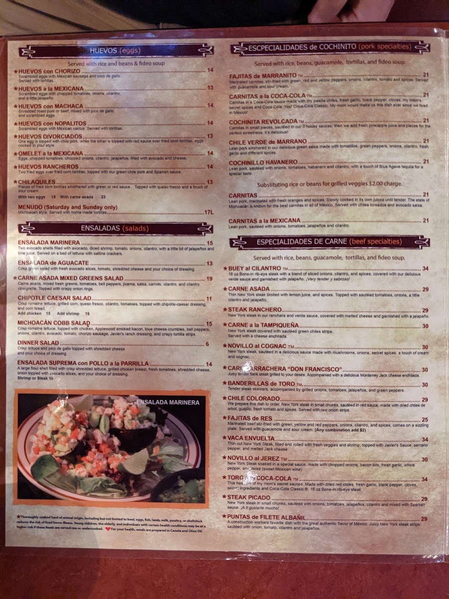 Marinated carnitas, stir-fried with green, red and yellow peppers, onions, cilantro, tomato and spices. Served with guacamole and sour cream. Served with rice, beans, guacamole, tortillas, and fideo soup.